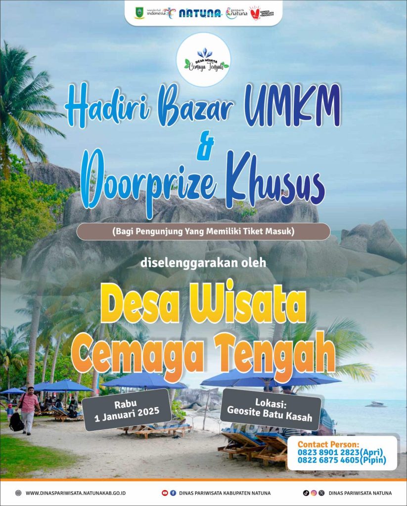 Desa Wisata Cemaga akan menyambut tahun baru 2025 dengan membuat event Bazar UMKM dan Doorprize yang akan dilaksanakan di Geosite Batu Kasah pada Rabu, 1 Januari 2025.