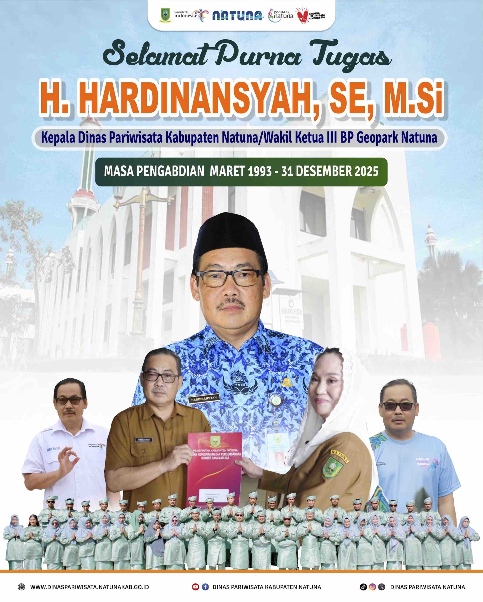Kepala Dinas Pariwisata Kabupaten Natuna, Hardinansyah, SE., M.Si, resmi memasuki masa purna tugas pada penghujung tahun 2025 setelah mendedikasikan diri selama 32 tahun.